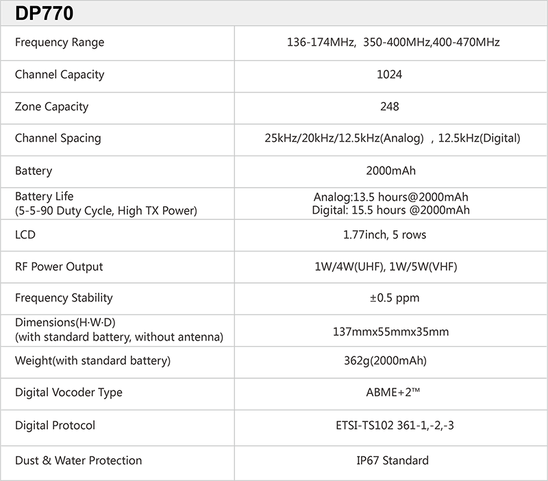 In addition to communication & data services, DP770 comes with supplementary functions such as Stun/Kill, Emergency, Man Down (standard), VOX, Lone Worker and Vibration.