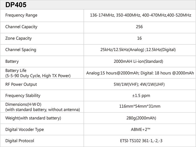 TDMA technology and power-saving feature enable the battery to work longer. DP405 with standard 2000mAH battery can work up to 15-18 hours in 5-5-90 mode.