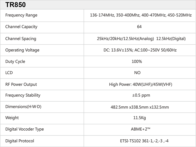 TR850 can be configured to analog, digital or mixed mode. When configured to mixed mode, the repeater can dynamically switch between analog and digital depending on the type of call it receives.